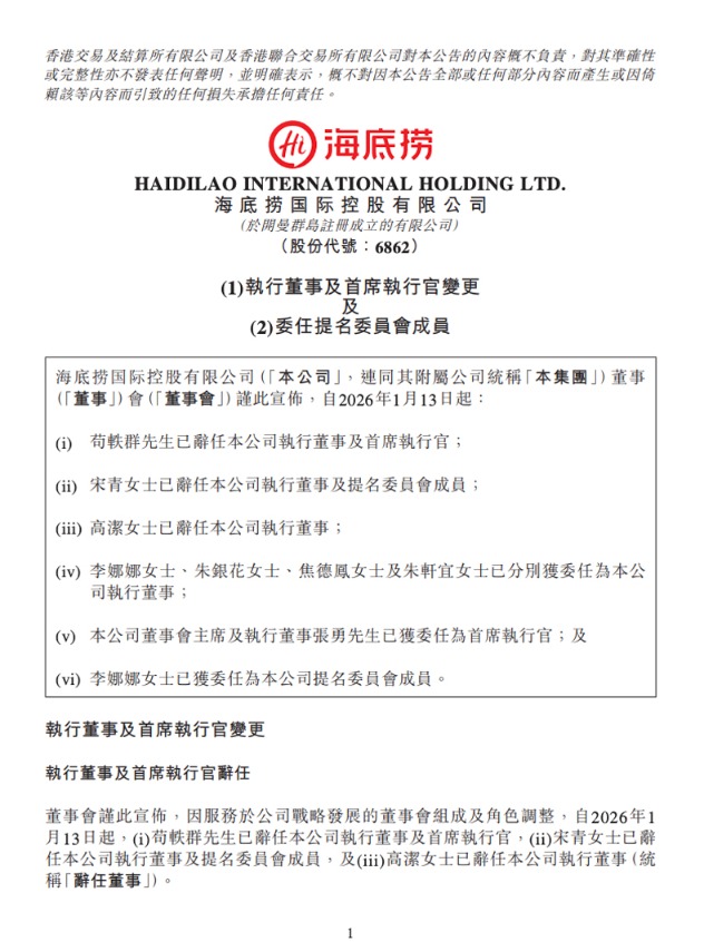 中新网1月13日电1月13日,海底捞发布公告称,董事会宣布,因服务于公司战略发展的董事会组成及角色调整,自2026年1月13日起苟轶群已辞任公司执行董事及首席执行官。基于对公司管理层安排的整体调整及综合考察,凤凰彩票app下载董事会主席兼执行董事张勇已获委任为公司首席执行官,自2026年1月13日起生效。