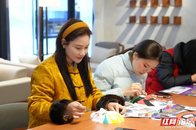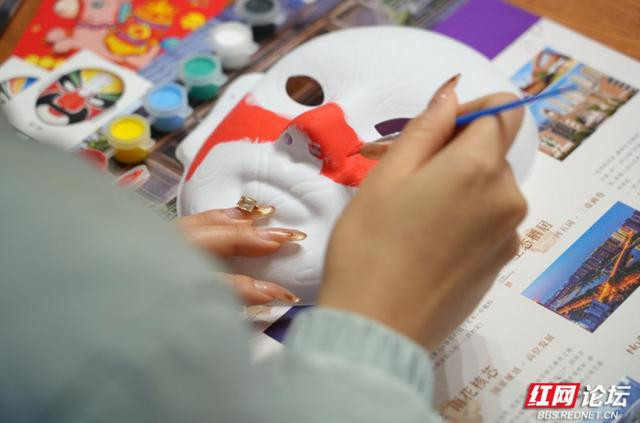 “民俗拾趣”区成了孩子们的乐园。脸谱绘制摊位上,几个小学生正专注地为白坯脸谱上色;拨浪鼓制作区里,木片碰撞发出清脆声响,与窗外浏阳河的涛声相映成趣。