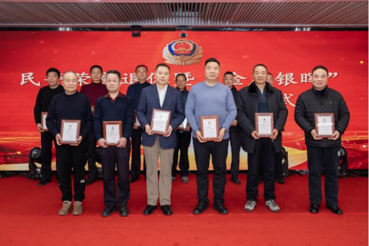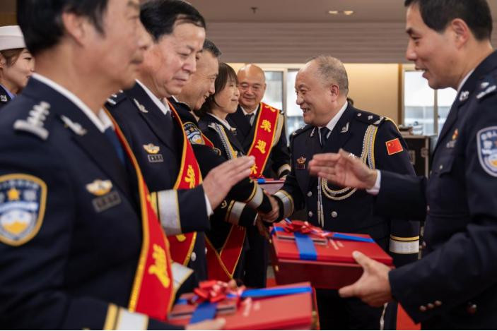 支队领导与王育华副处长共同为“金盾银晖”老同志授牌,宋伟刚支队长向志愿服务队授旗。这支由退休民警组成的志愿服务队,将继续为交通管理和社会服务持续贡献“银发”力量。