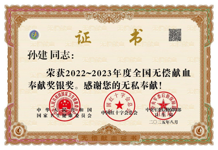 无偿献血,成了孙建生命的一部分,他先后获得2021-2022年度全国无偿献血奉献奖金奖、2022-2023年度全国无偿献血奉献奖银奖,凤凰彩票2023年还获得了武汉市稀有血型志愿者之家卓越贡献奖。