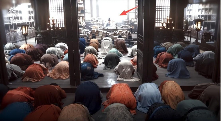 众人叩拜的镜头,五颜六色的服装,很有鲜活感,而上位者处的光线,糊眼的不得了,刻意营造神秘的氛围。