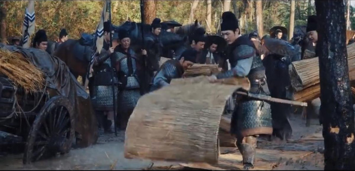 军队奔波时,因连绵大雨导致车马不好走,那稻草铺路的画面。