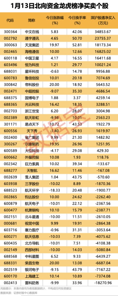 今日龙虎榜现身个股中,20股获北向资金净买入。净买入居首的是中文在线,金额为3.49亿元。通宇通讯、天龙集团、海格通信和中国卫星等紧随其后,净买入金额均超1.6亿元。