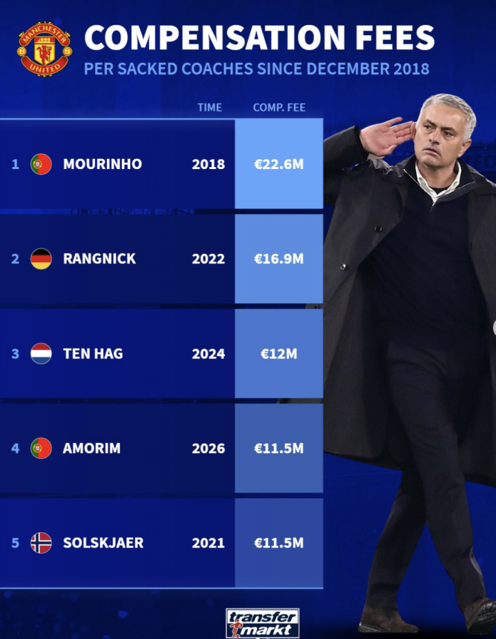 虎扑01月12日讯德转统计了自2018年12月以来,曼联解雇教练费用榜。