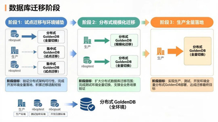 本次改造的核心突破在于数据库平滑迁移。NBOP系统成功完成从集中式数据库到国产GoldenDB分布式数据库的跨越,实现160亿条、11TB存量数据及700多张数据表的重构转移,全程业务“零中断”。迁移遵循“架构先行、分批落地、保障安全”核心逻辑,先确定分片部署模式,经测试验证后分批次推进用户迁移,配套数据准备与压测演练,同步搭建回切机制。