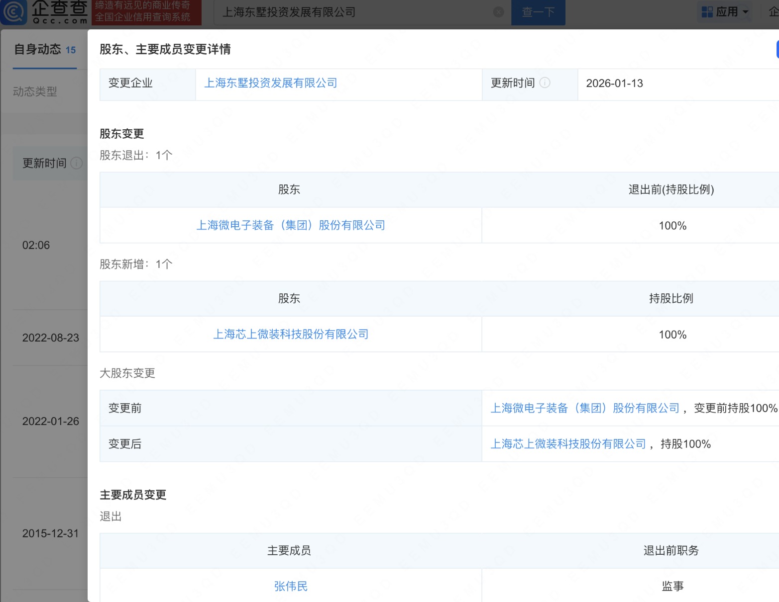 上证报中国证券网讯(记者秦春刚)1月13日,记者根据企查查最新工商信息显示,上海东墅投资发展有限公司(下称“东墅投资”)完成工商变更,上海微电子装备(集团)股份有限公司(下称“上海微电子”)正式退出股东行列,上海芯上微装科技股份有限公司(下称“芯上微装”)以全资股东身份入局,认缴出资额达2.52亿元。这是不到一个月内,芯上微装第二次接手上海微电子旗下资产,此前其曾以2.285亿元收购上海威耀实业有限公司(下称“威耀实业”)。