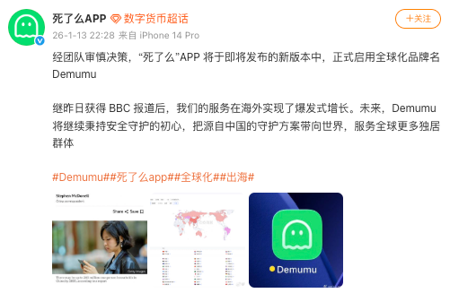 1月13日晚间,@死了么APP 发文称,经团队审慎决策,“死了么”APP将于即将发布的新版本中,正式启用全球化品牌名Demumu,凤凰彩票官网app“继昨日获得BBC报道后,我们的服务在海外实现了爆发式增长。未来,Demumu将继续秉持安全守护的初心,把源自中国的守护方案带向世界,服务全球更多独居群体。”