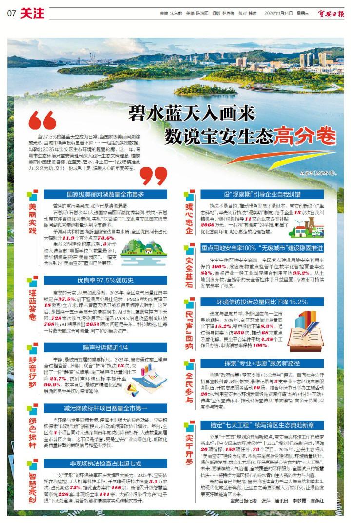 立足“十五五”规划的开局新起点,宝安生态环境工作已锚定新坐标:《宝安区生态环境保护“十五五”规划》已编制完成,明确20项指标、159项任务、73个项目。2026年,宝安生态将以“美丽宝安”建设为统领,系统实施包括党建领航、环境质量跃升、绿色低碳发展、数治生态深化、环保惠民暖心等在内的“七大工程”。未来,更精准的大气治理、全域覆盖的环评服务、全国试点的智慧执法……将持续为湾区核心的绿水青山注入新的活力与内涵。