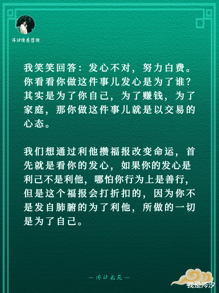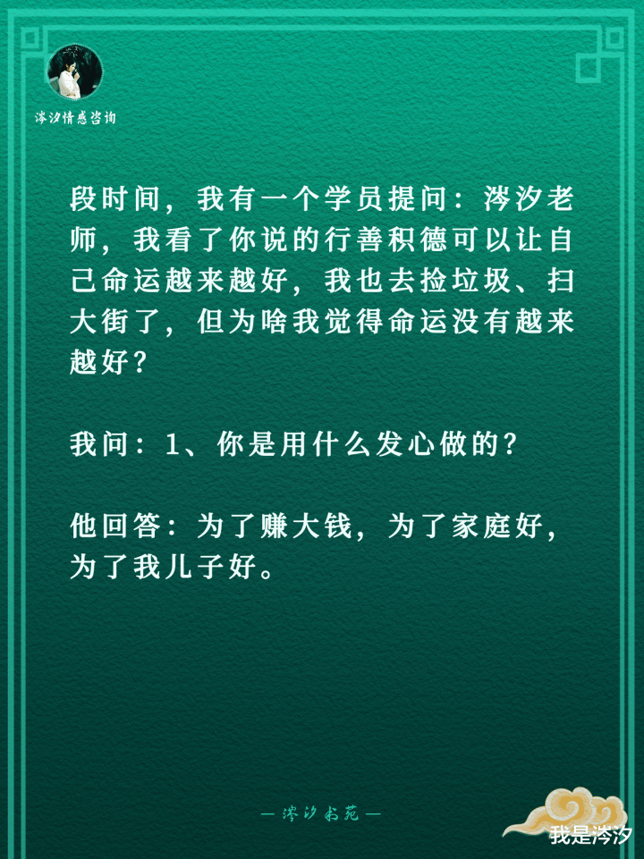 段时间,我有一个学员提问:涔汐老师,我看了你说的行善积德可以让自己命运越来越好,我也去捡垃圾、扫大街了,但为啥我觉得命运没有越来越好?我问:1、你是用什么发心做的?他回答:为了赚大钱,为了家庭好,为了我儿子好。