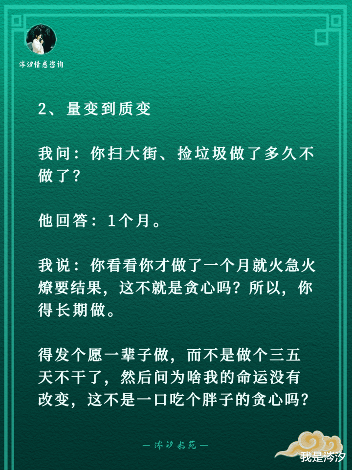2、量变到质变我问:你扫大街、捡垃圾做了多久不做了?他回答:1个月。我说:你看看你才做了一个月就火急火燎要结果,这不就是贪心吗?所以,你得长期做。得发个愿一辈子做,而不是做个三五天不干了,然后问为啥我的命运没有改变,这不是一口吃个胖子的贪心吗?