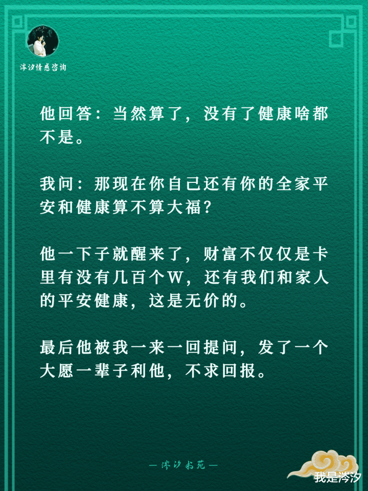 他回答:当然算了,没有了健康啥都不是。我问:那现在你自己还有你的全家平安和健康算不算大福?他一下子就醒来了,财富不仅仅是卡里有没有几百个w,还有我们和家人的平安健康,这是无价的。最后他被我一来一回提问,发了一个大愿一辈子利他,不求回报。