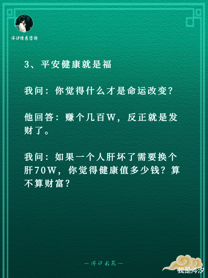 3、平安健康就是福我问:你觉得什么才是命运改变?他回答:赚个几百w,反正就是发财了。我问:如果一个人肝坏了需要换个肝70w,你觉得健康值多少钱?算不算财富?