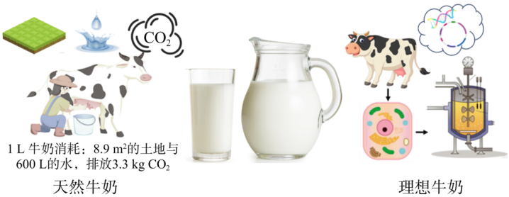 天然牛奶作为最理想的优质蛋白来源,其营养成分包含乳蛋白、生物活性肽、脂肪等,具有维持生命活动、促进生长发育及增强免疫力等多种功能。但目前天然牛奶面临养殖成本高、公共卫生安全及生产的可持续性等问题,亟待产业升级换代。近年来,包含基因编辑、合成生物学在内的多种前沿生物技术快速发展,为全球奶制品生产提供变革性的生产方式,如美国PerfectDay公司在2014年提出的无动物源牛奶(animal−freemilk)概念,利用改造后的酵母发酵生产乳蛋白,实现乳制品的绿色制造(图2)。