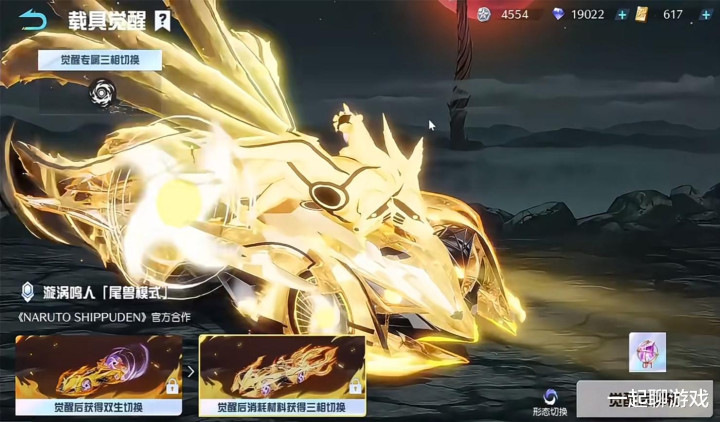 如图所示,漩涡鸣人系列的载具里,我们可以看到觉醒后获得双生切换,觉醒后消耗材料可以获得三相切换。