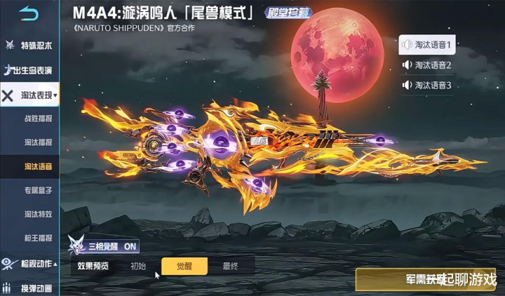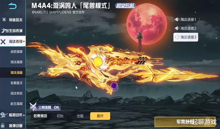 如图所示,我们以火影联名系列的M4为例,就拥有“三相觉醒”的功能,三种外观分别是初始、觉醒、最终。请注意,这3个外观并不是基础、进阶、高级,凤凰彩票官网app而是对应的三种完全不同的形态,玩家们可以自由切换任意一个。