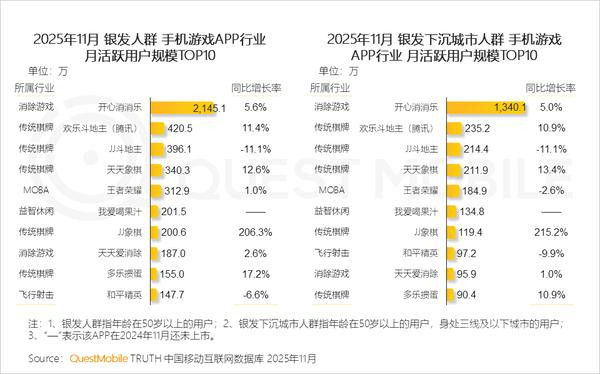 【CNMO科技消息】1月13日,QuestMobile 2025年11月的数据显示,银发人群(年龄在50岁以上)的游戏偏好呈现出强烈的“轻量化社交”与“经典怀旧”特质,消除类、传统棋牌类游戏需求强烈。