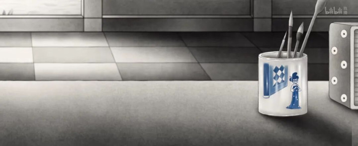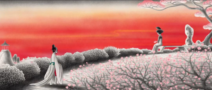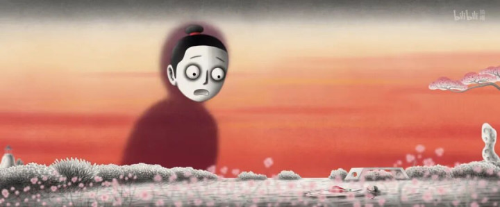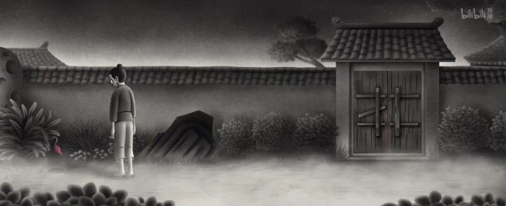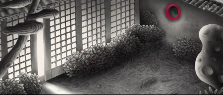 但书生的庭院,如这部动画的画风,只有几处关键点色彩斑斓点缀,其余全是黑白。