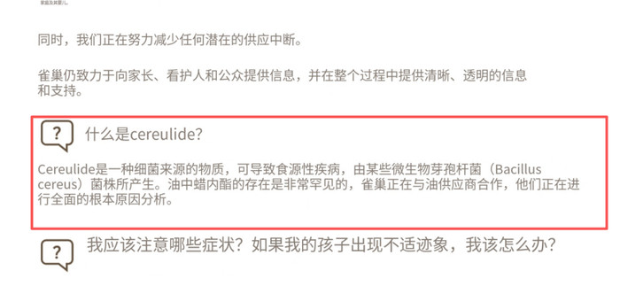 雀巢总部的公告提到,在发现一家主要供应商提供的某种原料存在质量问题后,雀巢对相关产品进行了花生四烯酸(ARA)油脂及相关油脂混合物检测,同时公告中也回答了外界较为关心的一些问题。例如,在说明的第一项,就介绍了何为蜡样芽孢杆菌以及服食过量后的症状。