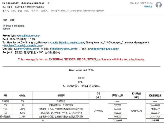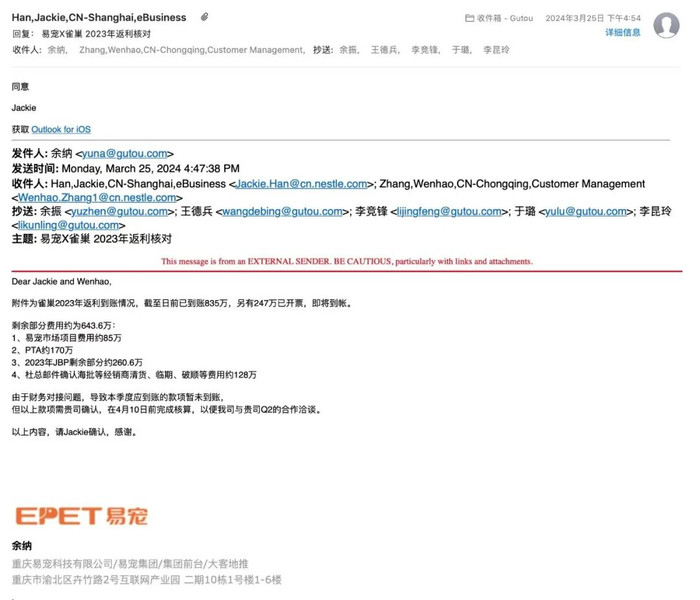 但雀巢从2023年第四季度就开始拖欠应该支付给易宠科技的补贴,又在2024年第一季度利用易宠不愿意浪费沉没成本的心态,声称只有继续合作,才能把上一年的欠款补上。